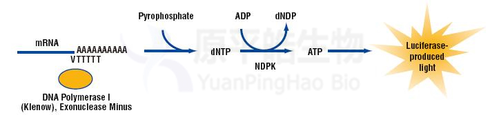 mRNA 的浓度和质量是微阵列分析、cDNA文库构建、PAGE等实验中重要的参数。传统的分光光度计方法无法区分总RNA中的rRNA和tRNA污染。基于DNA聚合酶I(Klenow; Exonuclease minus)焦磷酸化活性而设计的一种新型检测方法提供了灵敏而特异的检测Poly(A) mRNA的可能性。锚定寡核苷酸引物 oligo(dT)与poly(A) mRNA 杂交,伴随着焦磷酸化和转磷酸化反应,反应产物ATP与存在的poly(A)尾成正比。再通过对ATP浓度的检测确定Poly(A) mRNA 的浓度。原理: