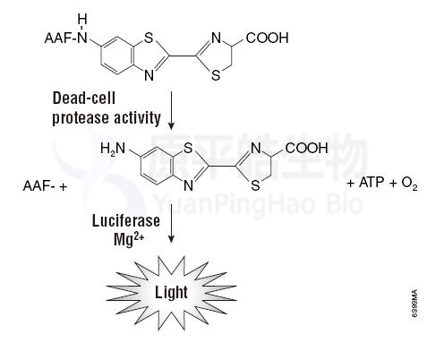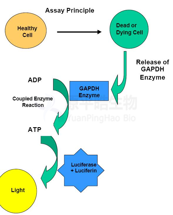 细胞毒性是由细胞或者化学物质引起的单纯的细胞杀伤事件,不依赖于凋亡或坏死的细胞死亡机理。当细胞受到损伤,细胞膜发生破裂,原本只存在于细胞内的多种物质(例如腺苷酸激酶GAPDH、乳酸脱氢酶LDH等)将被释放到细胞外。将这些酶的酶促反应与荧光素酶的发光相偶联,即可通过检测发光来测定细胞毒性。原理: