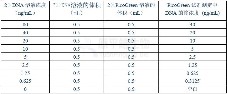 PicoGreen是以1mL的浓缩液形式保存在无水的 DMSO(二甲基亚砜)中。实验当天,配制 2 × PicoGreen试剂的工作溶液,用 1×TE按 1:200的比例稀释浓缩液(10mM Tris-HCl, 1mM EDTA,pH7.5)。如果要准备足够的工作溶液测定 20个样品,可在 20mL1x TE中加入 100μL PicoGreen dsDNA定量试剂。由于试剂容易吸附到玻璃表面,要在塑料容器中配制。 PicoGreen试剂见光易降解,所以应将配好的溶液用箔包住或放置暗处避光保存。