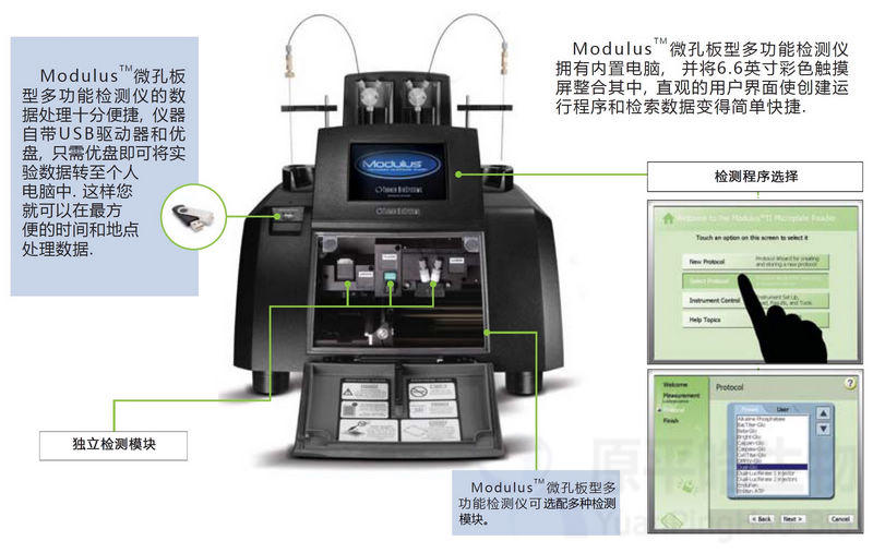 - 触摸屏:Modulus™ 微孔板型多功能光度计配有内置电脑, 触摸屏操作, 使用非常简单;