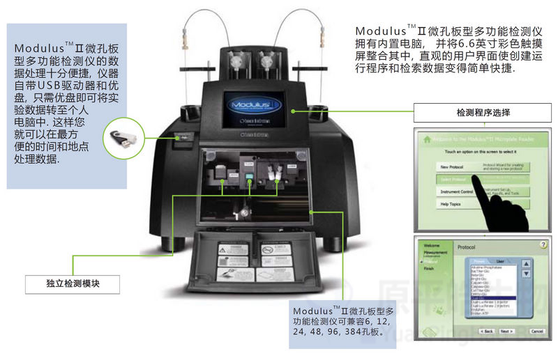 - 触摸屏:Modulus™ II微孔板型多功能检测仪配有内置电脑, 触摸屏操作, 使用非常简单;